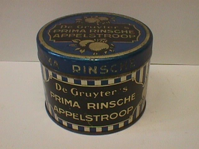 - BeschrijvingMetalen pot met deksel in de kleuren blauw-zilver-zwart De Gruyter's prima rinsche appelstroop. Op het blik staan verticale strepen in de kleuren zilver en blauw. Naast de tekst staan aan weerzijden twee appels afgebeeld. Op het deksel staan boven en onder de tekst twee appels afgebeeld. Het blik is leeg.