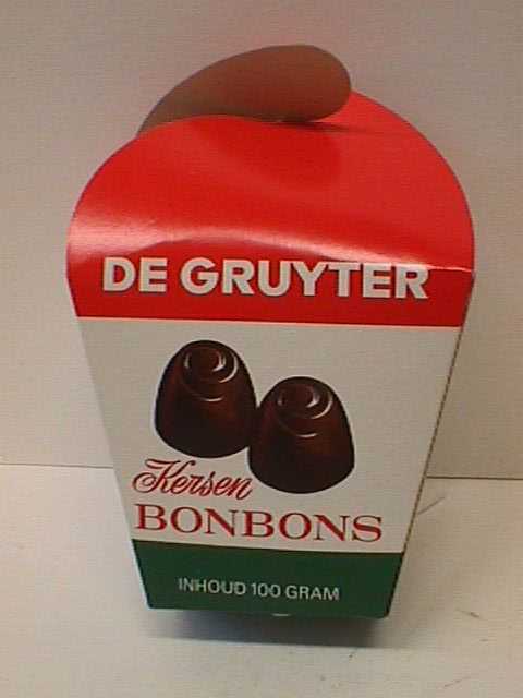 - BeschrijvingKartonnen verpakking De Gruyter, met cherry gevulde, kersenbonbons, inhoud 100 gram. De verpakking is rood met wit en groen. Op de verpakking staan op de voor- en achterkant twee kersenbonbons afgebeeld. Het pak is leeg.
