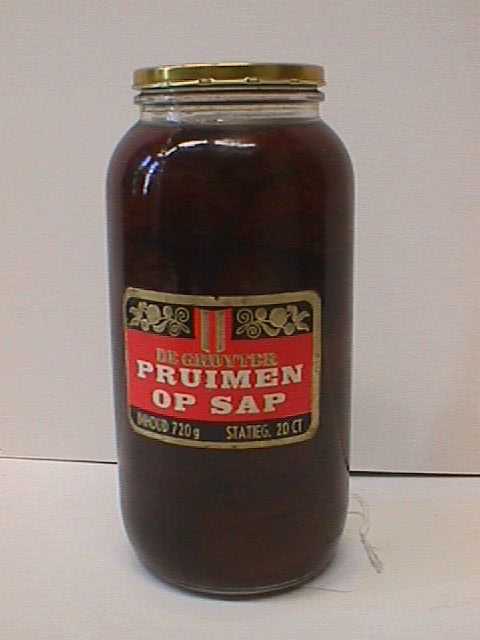 - BeschrijvingGlazen pot met een metalen klemdeksel en een papieren etiket waarop tekst staat. Het etiket is rood met zwart en goud. In het zwart staan gouden ornamenten De pot is gevuld met bruinrode vloeistof en bruine vruchten.