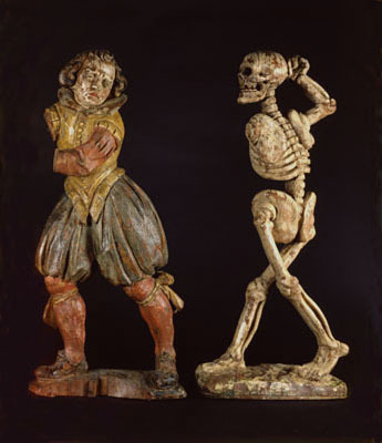 Deze twee beelden maakten deel uit van de zogenaamde Dodendans van het Laatste Oordeelspel in de Sint-Jan. Daarin achtervolgde de Dood met zeis of speer personen uit alle standen van de maatschappij. Zou behoren tot het beeldhouwwerk van een uurwerk dat oorspronkelijk in de Sint-Jan was opgesteld. Dit lijkt echter niet waarschijnlijk gezien het verschil in uitvoering (vgl. Mosmans). De dood zou horen bij het torentje van het Oordeelspel.