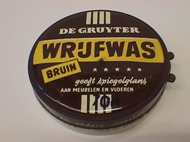 - BeschrijvingMetalen blik De Gruyter wrijfwas in de kleur bruin. Het blik bestaat uit twee delen die door middel van een koperkleurige draaiknop van elkaar gaan. het bovenste deel is hoofdzakelijk bruin, het onderste deel creme kleurig. Het blik is (gedeeltelijk) gevuld.