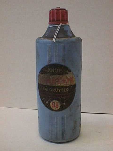- BeschrijvingPlastic fles met plastic schroefdop en een papieren etiket. De fles bevat inhoud, is blauw en de dop is roze.