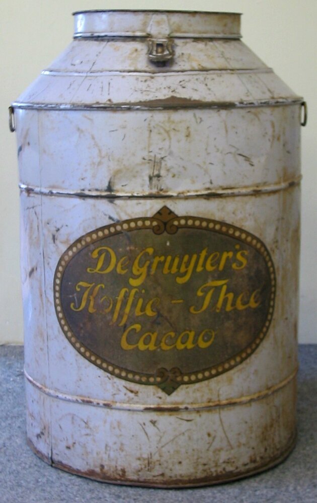 - BeschrijvingRonde metalen bus voor het opslaan en distribueren van koffie, thee en cacao. De bus heeft twee handvatten en een scharnierend deksel met sluiting. Op de bus is een geschilderd etiket met de tekst DE GRUYTER'S KOFFIE-THEE CACAO.