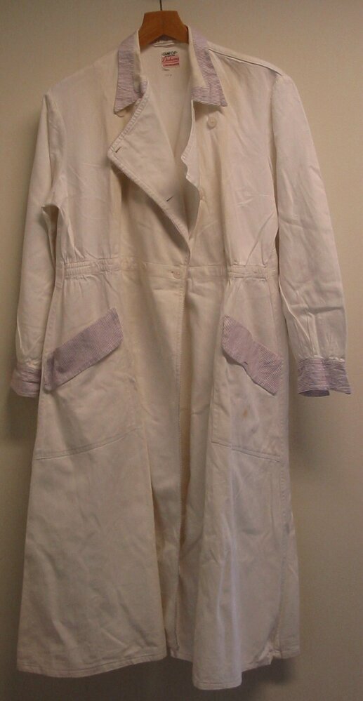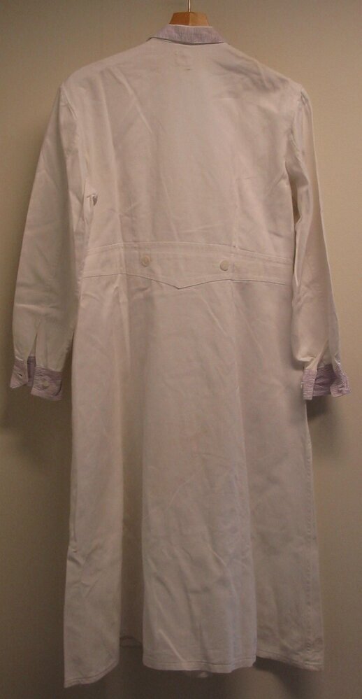 Witte jasachtige schort met lange mouwen. Elastiek in taille en voorsluiting van drie witte knopen in dubbele rij. Aan de achterzijde zijn in de taille twee witte knopen genaaid. De kraag, machetten, zakken en voorsluiting zijn afgewerkt met wit met paars gestreepte stof. De machetten hebben een sluiting met een witte knoop.