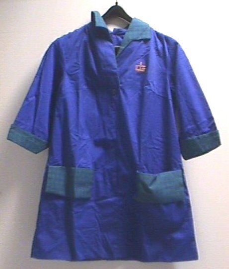 - BeschrijvingDonkerblauwe blouse voor fabriekspersoneel van De Gruyter met v-hals en achtersluiting via vijf donkerblauwe knopen. Kraag, machetten en zakken zijn afgewerkt met een groen met blauw geruite stof. De mouwen hebben een driekwart lengte. Er hoort een losse donkerblauwe ceintuur bij, deze zit opgerold in de zak.