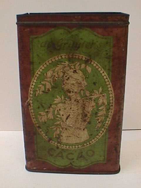 - BeschrijvingRechthoekige metalen bewaarbus zonder deksel. Op de bus staat een afbeelding van een vrouw met hoofddoek en takken. Op de zijkanten staan takken van de cacaoboom afgebeeld. Het blik is vooral bordeauxrood, groen en cremekleurig.