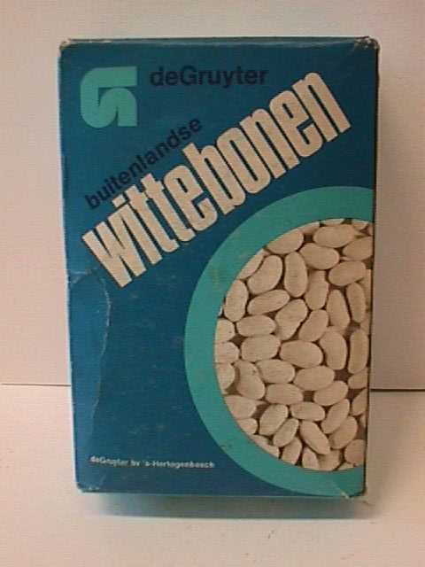 - BeschrijvingKartonnen verpakking gevuld met buitenlandse witte bonen, inhoud 500 gram. Op de ene zijkant staat de bereidingswijze van stoofschotel van groene erwten, op de andere zijkant de voedingswaarde. Het pak is vervaardigd in de kleuren blauw. Op het pak staan witte bonen afgebeeld. Het pak is vol.