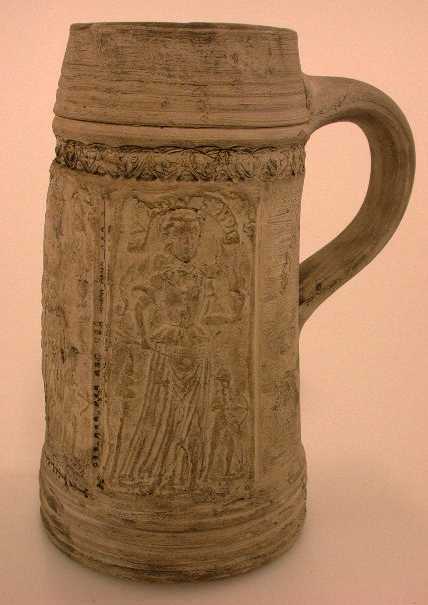 -vlakke bodem -geprofileerde cilindrische voet -cilindrisch, iets conisch toelopend lichaam met reliëfversiering, bestaande uit 3 rechthoekige vormen, ieder versierd met voorstelling van Venus, in de linkerhand een vlammend hart, in de rechter een pijl, en een Amor met pijl en boog; boven het hoofd van Venus een boogvormige band met de inscriptie VENUS 1591; de vormen zijn met zwarte stipjes omrand; aan de bovenkant van het lichaam een gestempeld bladmotief -geprofileerde conisch toelopende hals -eindigend in een gladde mondrand -rond, vertikaal, worstvormig oor aangezet op onderkant lichaam en onder de mondrand.
