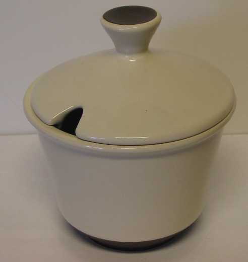 - BeschrijvingCremekleurige ronde suikerpot van porselein met een bruine onderrand. De suikerpot heeft een deksel met een zegelvormige knop, waarvan de bovenkant bruin is.