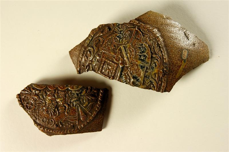 - BeschrijvingDe 2 scherven vormen samen een deel van de buik van een kan waarop een ovaal reliƫf van 12,5 x 15 cm. Daarbinnen een door ranken omlijst wapen met aan de bovenkant 4 helmen met achtereenvolgens het helmteken, een gewei (?), vleugels en een rad; daarboven binnen stippen het jaartal 1603. Bruin/grijs gevlekt zoutglazuur