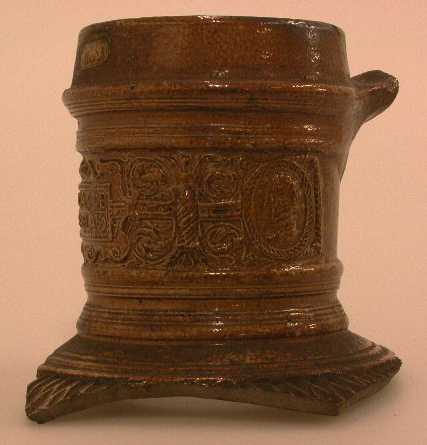 - schouder met kerfsnedeversiering afgesloten door profileringen - cilindervormige hals met profielen onder en boven, waartussen een reliëfband bestaande uit: 2 medaillons met een kop, aan iedere kant, daartussen blad- en rankmotieven en in het midden een rechthoekige cartouche met opschrift:LVCAS . DE WAELA 1597 - gekraagde teruglopende mondrand - ooraanzet op ribbel tussen hals en mondrand - indrukken van tinnen deksel op ooraanzet - bruin/grijs zoutglazuur