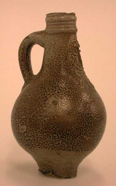 - gladde voet - bolvormige buik - lange nauwe hals - geprofileerde mondrand door kraagrand gemarkeerd - een worstvormig oor aangezet onder mondrand en op buik - op hals en bovengedeelte buik baardman met lange brede hoekige baard - bruin/geel/grijs gevlekt zoutglazuur - aanzetten tot versieringen links en rechts onder de baardman (op de oude inv.kaart is aangetekend "bovendien versierd met een roset").