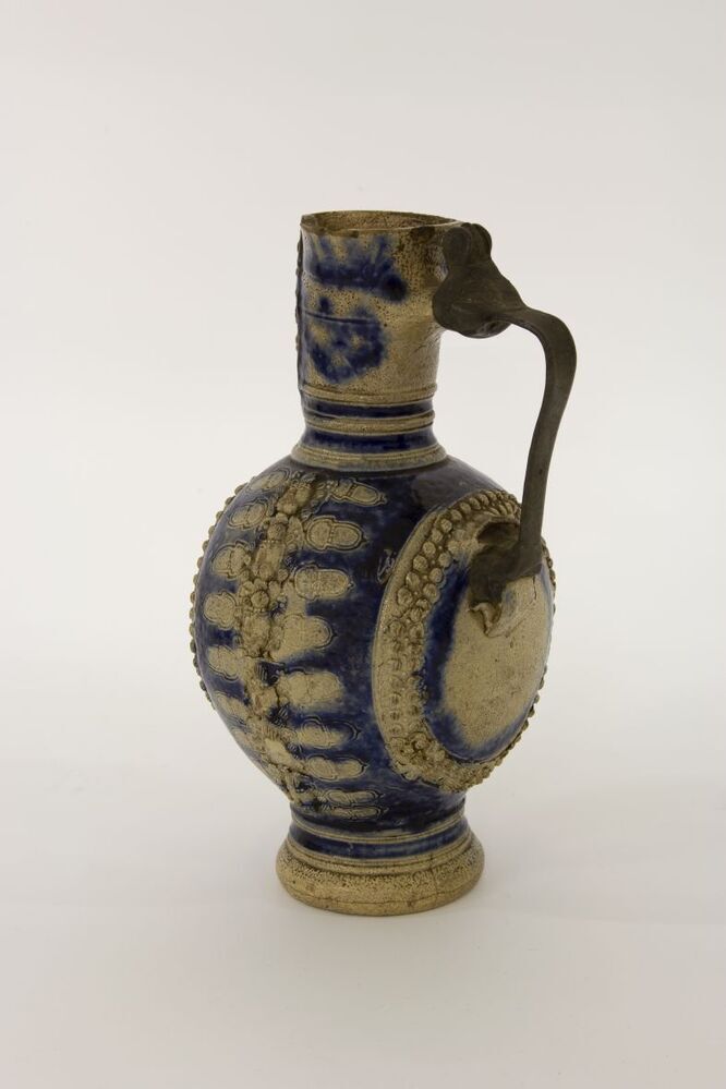 - geprofileerde vlakke voet - bolvormig, aan de zijkanten afgeplat lichaam - geprofileerde nauwe hals die iets wijder, glad uitloopt naar de - mondrand met schenktuit - tinnen bandoor (later, na vondst, aangezet) met korte staart van steengoed - scharnierpunt van tinnen deksel - grijs zoutglazuur met kobaltblauw - reliëfversiering op buik en hals a. op de buik een groot medaillon met randversiering binnen een rand kobaltblauw een medaillon met de voorstelling van een cherubijn boven blad- en bloemversieringen b. rond het oor eenzelfde medaillon, zonder middenmedaillon c. tussen de medaillons in een vertikale reeks van 6 koppen aan beide zijden begrensd door een gestempeld eikelmotief d. op de hals een baardman met open mond, door ranken omgeven