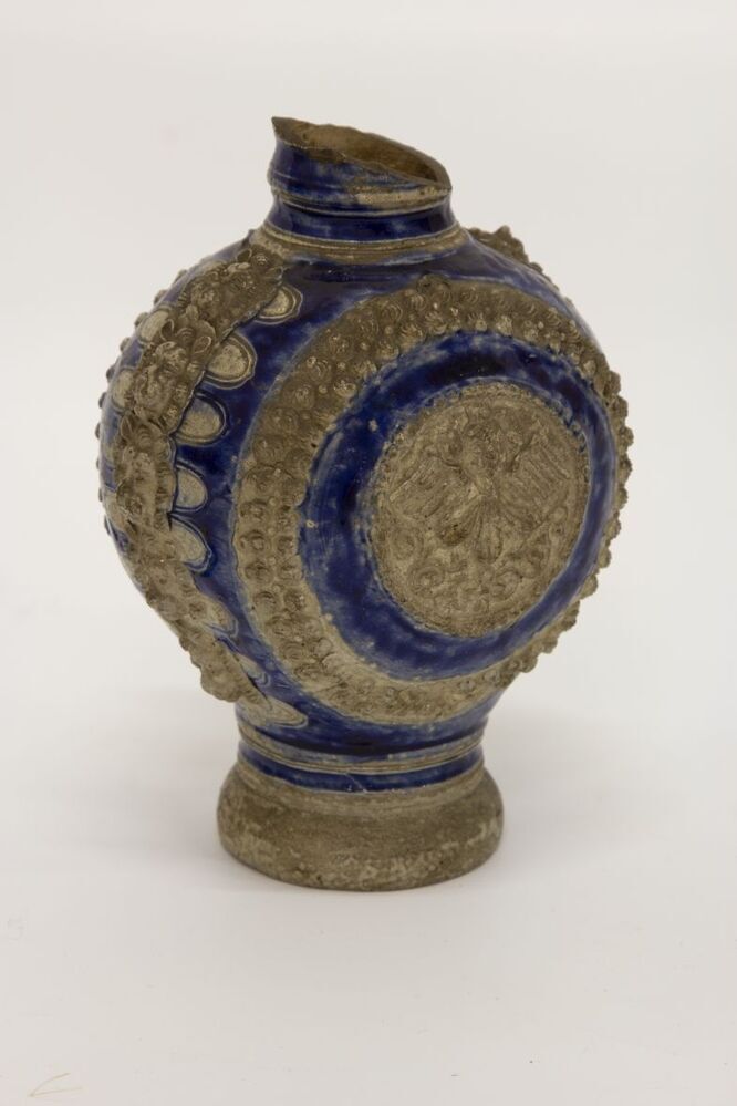 - geprofileerde voet - bolvormig lichaam aan de zijkanten afgeplat - nauwe cilindrische geprofileerde hals - gekrulde staart van het oor aangezet op het lichaam - grijs zoutglazuur met kobaltblauw - reliëfversiering op de buik a. een groot medaillon met randversiering, binnen een rand kobaltblauw een medaillon met versierde rand waarbinnen een cherubijn boven ranken b. rond het oor een dergelijk medaillon zonder middenmedaillon c. tussen de medaillons een vertikaal reliëf van 5 koppen met aan weerszijden een gestempeld eikelmotief