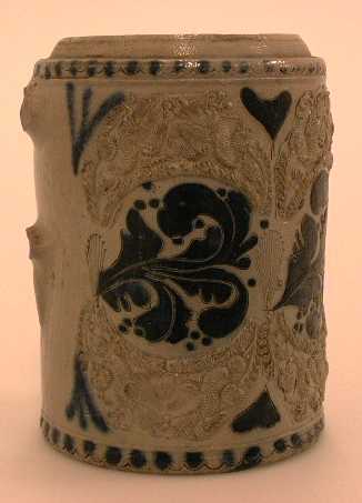 - vlakke voet - cilindervormig lichaam - boven voet en onder mondrand geprofileerde banden met een boogfriesje in stippeltechniek en kobaltblauwe stippenbeschildering - vernauwde mondrand - aanzetten tot vertikaal oor met staart op het midden van het lichaam en onder mondrand - grijs zoutglazuur met kobaltblauwe beschildering, in- en uitwendig - onder en boven 4 spiegelbeeldige reliëfversieringen van vogels en bloemen, die in het midden met bogen een zone afsluiten, waarop kobaltblauwe bloemen en stippen geschilderd zijn, gescheiden van elkaar door een waaiervormige ingekraste versiering