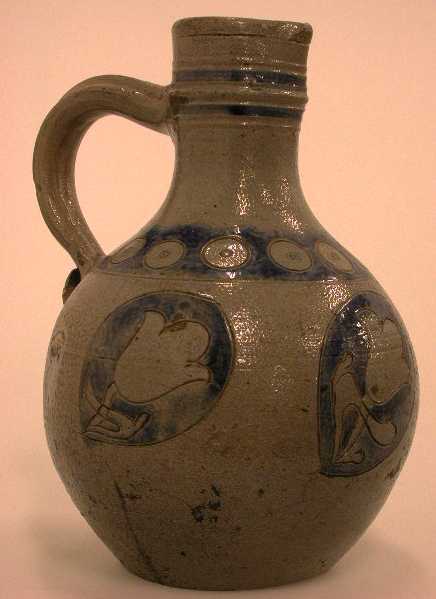 -vlakke voet - bolle buik met draairibbels en 3 ingekraste tulpmotieven in grijs op een schuin blauw ovaal - overgang naar schouder door groef gemarkeerd; daarboven een blauw geschilderde band waarin 9 grijze cirkels die een cirkeltje omschrijven - cilindervormige hals met profileringen en blauwe randen in het midden - overgang naar mondrand uit een groef bestaand - ronde mondrand met schenktuit - geprofileerd bandvormig oor met omgekrulde staart, aangezet op buik en onder mondrand - grijs zoutglazuur met kobaltblauwe beschildering