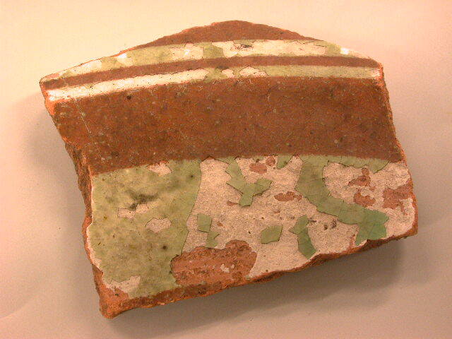 - BeschrijvingVlakke vorm met een ronde geprofileerde rand - bruin loodglazuur, witte engobe met daarop licht- en donkergroen gevlekt loodglazuur, naar het midden met bruine concentrische strepen overtrokken