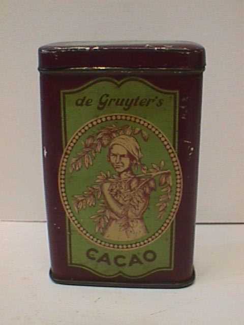 - BeschrijvingRechthoekige metalen bewaarbus met los metalen rechthoekige deksel. Op de bus staat een afbeelding van een vrouw met hoofddoek en takken. Op de zijkanten staan takken van een cacaoboom afgebeeld. Het blik is bordeauxrood, groen en cremekleurig.