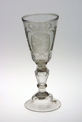 - BeschrijvingGedoomde (klokvormige?) voet met rij ovale ogen. Negenhoekige gefacetteerde balusterstam met twee ringnodi. Trechtervormige cuppa met hoekige en gefacetteerde schouder. Radgravure gekroonde wapen Willem IV tussen twee lauwertakken.