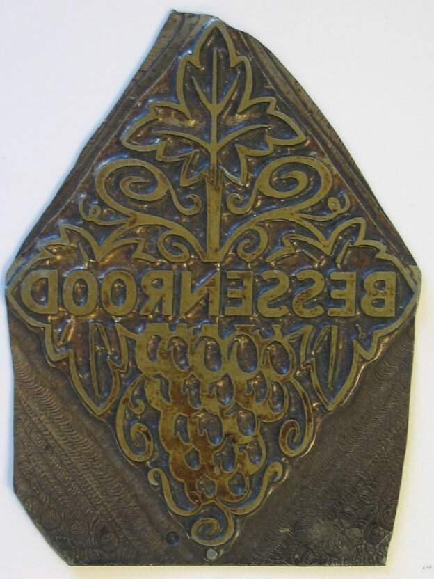 - BeschrijvingMetalen drukplaat met daarop in spiegelbeeld een afbeelding van een tros bessen en het woord BESSENROOD.