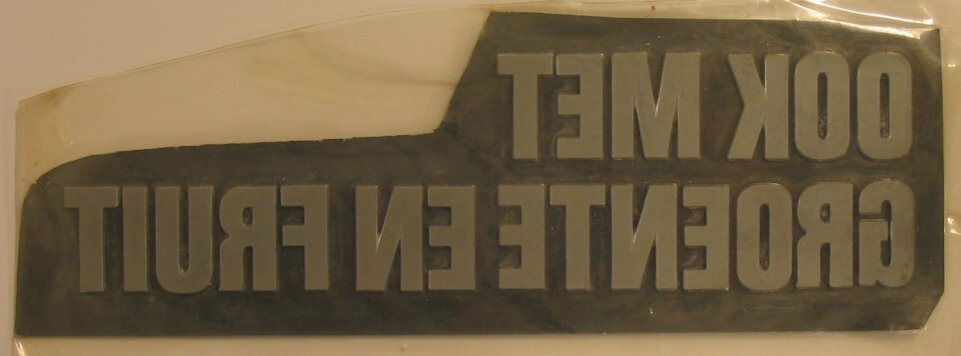 Metalen drukplaat met de tekst OOK MET GROENTE EN FRUIT.