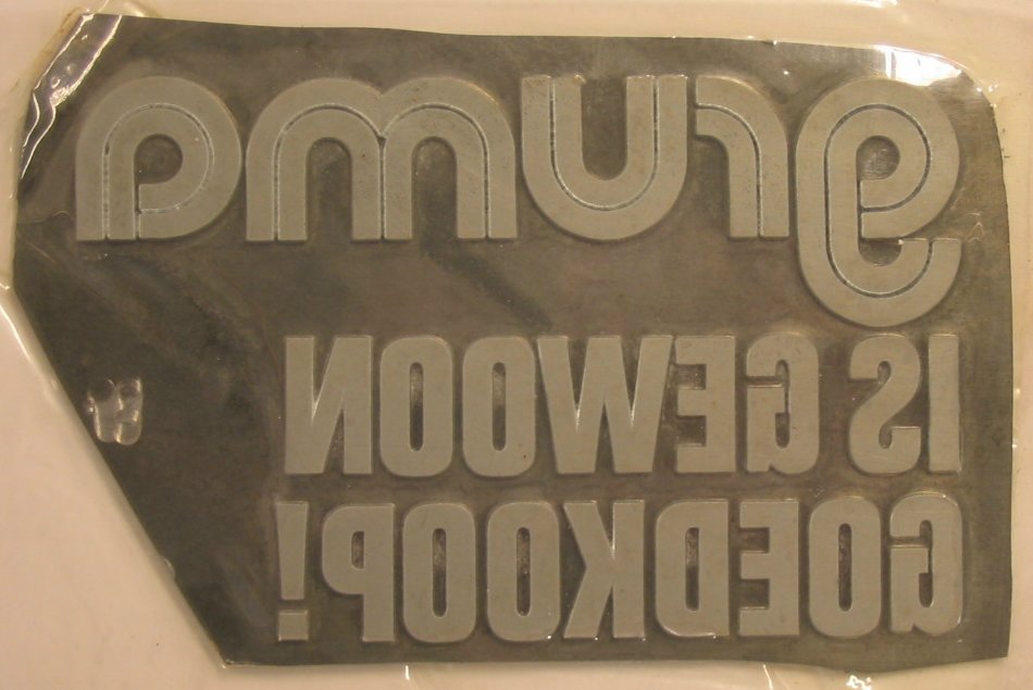 Metalen drukplaat met de tekst GRUMA IS GEWOON GOEDKOOP!