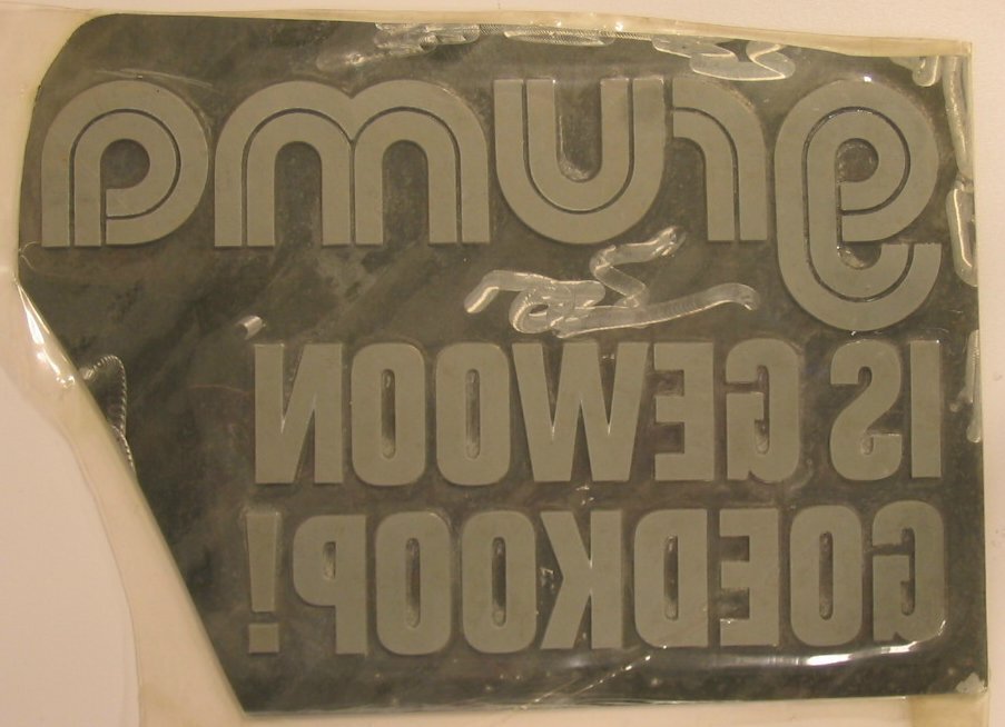 Metalen drukplaat met de tekst GRUMA IS GEWOON GOEDKOOP!
