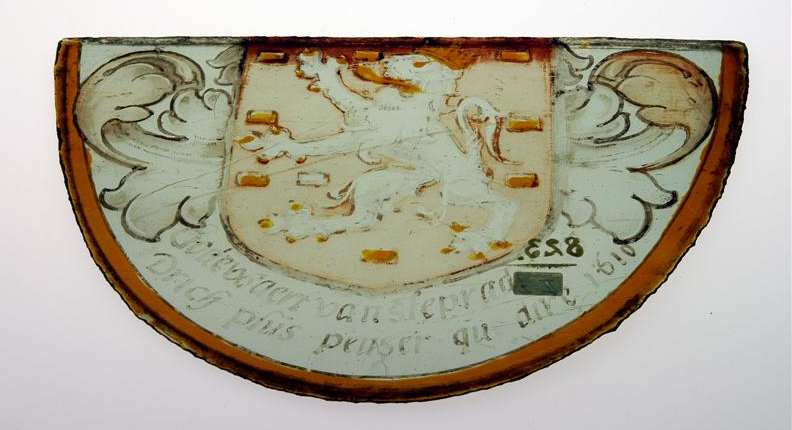 - BeschrijvingHalf ovaal vensterglas, de ronding naar beneden, met oranje randband, een wapen met een zwarte (?) leeuw, met gouden kroon, tongen, nagels, op een rood veld met gouden turven. Eronder, in zwart: Godewaert van steprade, ven/ Drich plus penser que dire 1610.