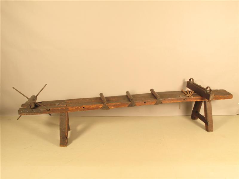 Een stellage, bestaande uit een horizontaal blad, dat is vervaardigd uit drie zware eiken balken, rustend op twee vaste schragen. Aan het ene uiteinde is een dwarsblok gemonteerd met uitsparingen en beugels, waarin de armen werden vastgehouden. In het midden drie beweegbare rollen. Aan het andere uiteinde, bestaande uit een dikke balk, is een rondsel bevestigd met vier spaken en een tandwiel met een pal.