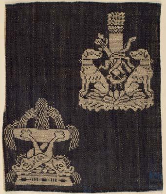 Linnen damast in donkerblauw en naturel, geweven in 8-schacht satijnbinding (ketting = donkerblauw inslag naturel). Op het fragment 2 voorstellingen. Bovenaan twee jachthonden, hurkend aan weerszijden van jachttrofee, bestaande uit pijlkoker, jachtmes, boog en hoorn. Onderaan een spuitende fontein, steunend op een plateau met 3 dolfijnen. Aan de zijde van de jachthonden bevindt zich de zelfkant.