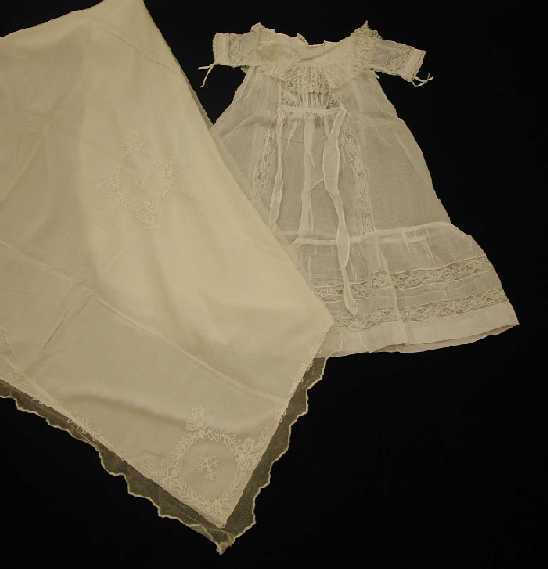 - TitelDoopjurk van witte katoenen batist en kant met doopsprei