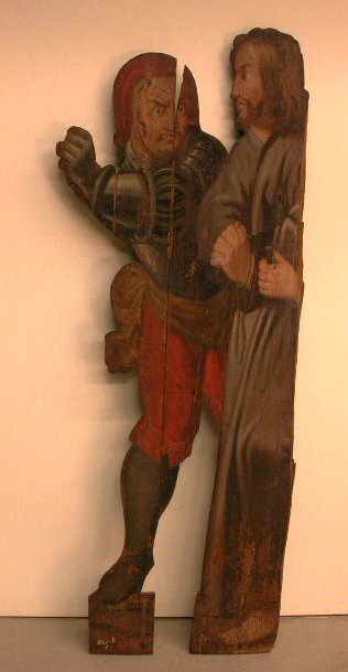 - BeschrijvingDe geboeide Christus, gekleed in een paars gewaad, wordt met de vuist bedreigd door een soldaat. Deze draagt een rode broek, en heeft een wapenuitrusting aan.