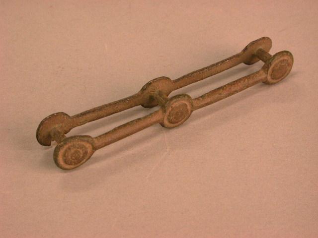 Een bronzen beslag met drie aan beide zijden afgeplatte nieten.