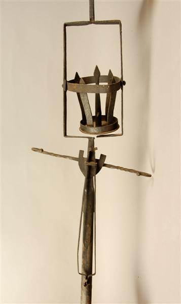- BeschrijvingRonde ijzeren korf met opzetpin, scharnierend hangend in een verticaal rechthoekig frame, met punt op top, bevestigd op houten stok, met ijzeren punt. Hangend aan haak op schilde aan stok een langwerpige platijzeren tang uit één stuk.