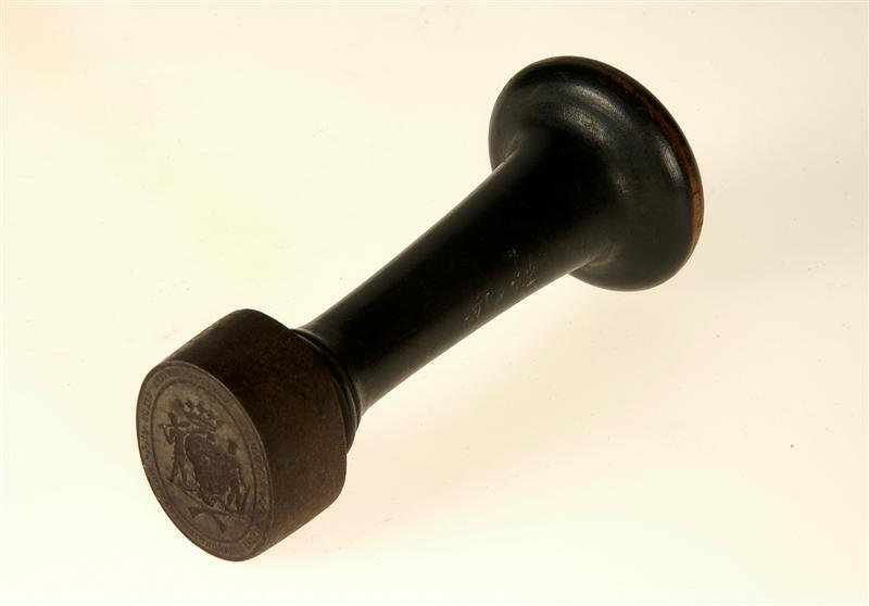 Ovaal zegelstempel met het wapen van de gemeente 's-Hertogenbosch: Op het schild van sabel een boom van goud, in de rechterbovenhoek een gevierendeeld vrijkwartier: 1 en 4 in sabel een leeuw van goud, getongd en genageld van keel, 2 en 3 in zilver een dubbelstaartige leeuw van keel, gekroond, getongd en genageld van goud; een schildhoofd van goud met een uitkomende dubbele adelaar van sabel met een schildje voor zijn borst, in keel met een dwarsbalk van zilver het schild wordt gedekt door een hertogelijke kroon, ter weerszijden gehouden door een wildeman, gewapend met knots. Onder het schild twee gekruiste geweren. Een houten handvat is op de achterzijde in een ronde koperen huls bevestigd.