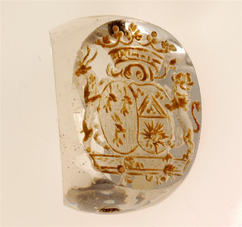 Kristallen zegelstempel met twee wapenschilden: I. Ovaal schild, met drie konijnen (?) op sabel als schildhouder een steenbok II: Renaissanceschild met op het bovenste gedeelte een driehoek en op het onderste een zon. Als schildhouder een leeuw. De beide wapenschilden worden gedekt door een markiezenkroon. (Mogelijk zijn dit de wapens van de familie Van Sonsbeek en van Van der Goes)