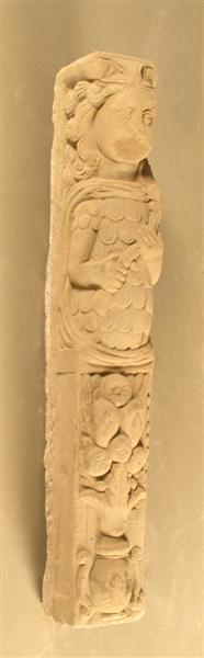 - BeschrijvingLos bovenstuk met zittende leeuw als schilddrager, fakkeldragende vrouwelijke (?) karyatide gestileerd bloemboeket los voetstuk met gestileerd floraal motief.