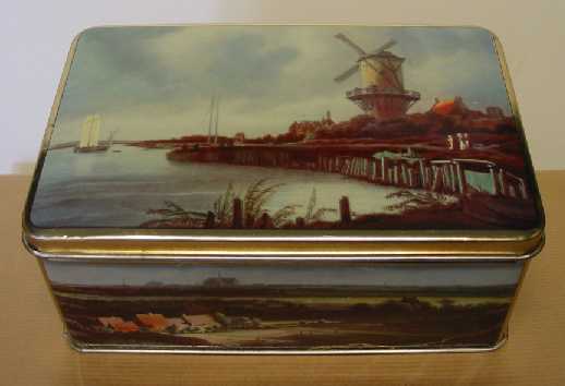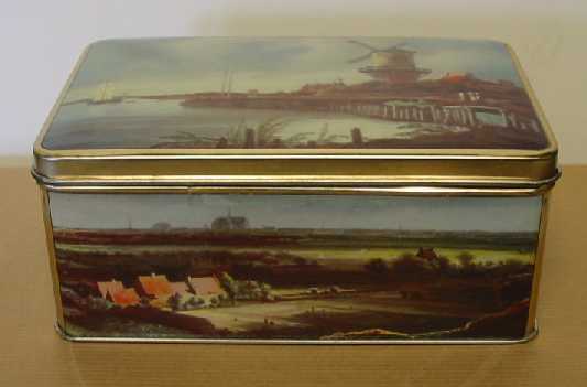 - BeschrijvingMetalen cacaoblik met erop afgebeeld diverse typisch Hollandse landschappen. Het blik is leeg.