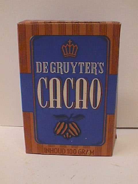 - BeschrijvingKartonnen verpakking in de kleuren blauw en bruin van De Gruyter's cacao. Op de verpakking staat de afbeelding van een kroon en drie cacaobonen. De inhoud is 100 gram. Het pak is leeg.