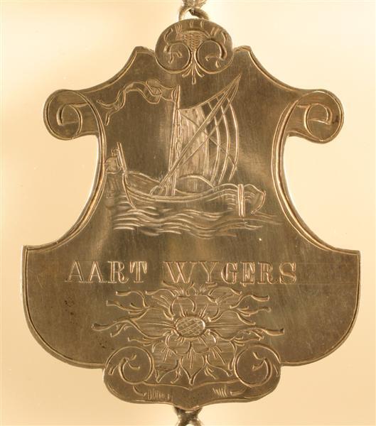 - BeschrijvingSchild met afbeelding van een boot met één mast en één zeil en twee vlaggen. Daaronder inschrift: "AART WYGERS'. Daaronder gegraveerde bloemdecoratie. Schild heeft onregelmatige contouren. Midden boven en -onder aan de achterzijde een haak i.v.m. de bevestiging. Langs de rand een gegraveerde lijn en voluten ter decoratie.