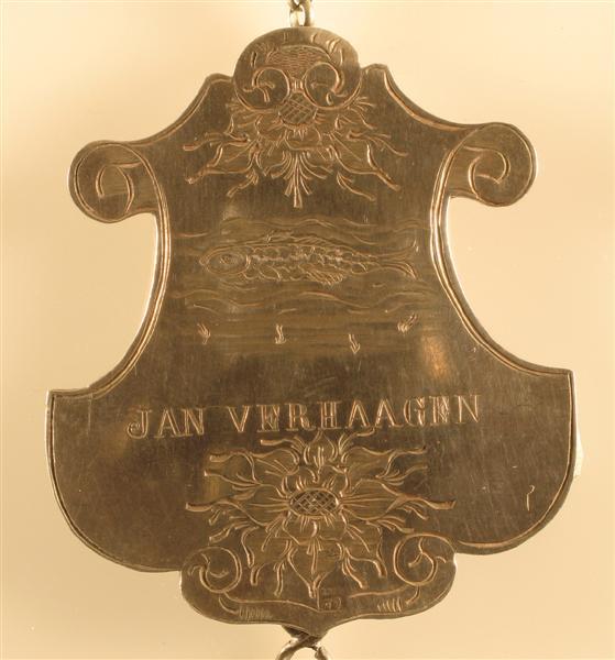 Schild met afbeelding van een vis in het water. Daaronder inschrift: "JAN VERHAAGEN". Daaronder en boven de vis een gegraveerde bloem. Schild heeft onregelmatige contouren. Midden boven en -onder aan de achterzijde een haak ter bevestiging. Langs de rand een gegraveerde lijn en voluten ter decoratie.