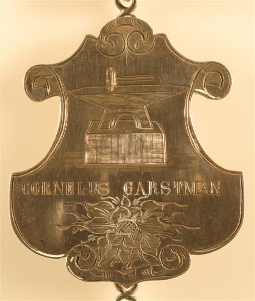 Schild met afbeelding van een hamer met aambeeld. Daaronder inschrift: "CORNELIS GARSTMAN". Daaronder gegraveerde bloem. Schild heeft onregelmatige contouren. Midden boven en -onder aan de achterzijde een haak ter bevestiging. Langs de rand een gegraveerde lijn ter decoratie met voluten.