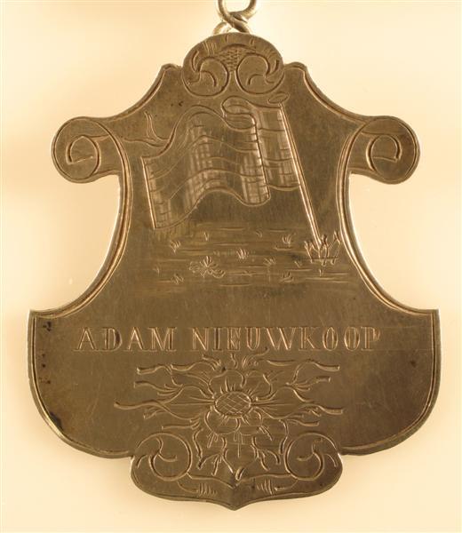 Schild met afbeelding van een vlag en wimpel wapperend naar links. Daaronder inschrift: "ADAM NIEUWKOOP". Daaronder een gegraveerde bloem. Schild heeft onregelmatige contouren. Midden boven aan de achterzijde een haak i.v.m. de bevestiging. Langs de rand een gegraveerde lijn met voluten ter decoratie.