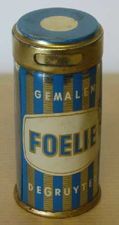 - BeschrijvingMetalen blauw-gouden strooibus met draaiafsluiting zuivere gemalen foelie, 25 gram. De onderkant van de bus is goudkleurig. De bus bevat inhoud. Midden bovenop de bus bevindt zich een witte stip. .