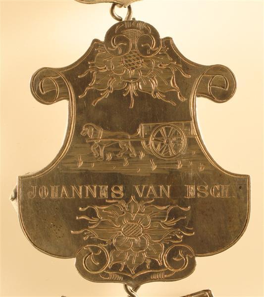 - BeschrijvingSchild met afbeelding van een hond, die een 2-wielige wagen trekt, naar links. Daaronder inschrift: "JOHANNES VAN ESCH." Daarboven en -onder een gegraveerde bloem. Schild heeft onregelmatige contouren. Aan achterzijde midden boven en -onder een haak ter bevestiging. Langs de rand gegraveerde lijn en voluten ter decoratie.