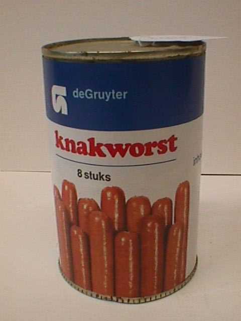 - BeschrijvingLeeg conserven blik met de onderkant eruit gehaald. Met blauw en wit etiket erop. Op 2 kanten staat de afbeelding van 13 verticale knakworstjes. Boven de afbeelding staat tekst en het logo van de Gruyter van na 1972.