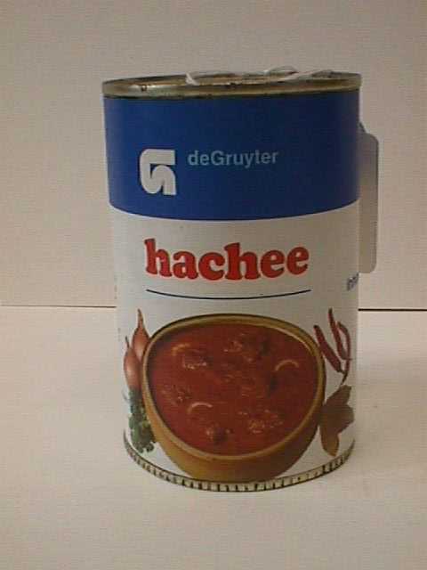 - BeschrijvingLeeg conserven blik met de onderkant eruit gehaald. Met blauw en wit etiket erop. Op 2 kanten staat de afbeelding van een pan met daarin hashee, ernaast liggen 2 uien, 3 rode pepers, laurierblaadjes en peterselie. Er staat ook een gebruiksaanwijzing op het etiket.