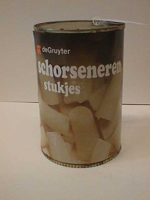 - BeschrijvingLeeg conservenblik.Het etiket is een foto van de inhoud ( dus stukjes schorseneren) met daarover heen tekst, oa. de gebruiksaanwijzing.