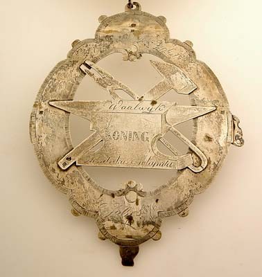 Uitgezaagd schild, waarop bevestigd een aambeeld, een smeedhamer en een tang en met het opschrift: "Gilde van St.Jan Baptist/Waalwijk/KONING/Hendrikus v. Schijndel/10 julij 1876" Schild heeft onregelmatige contouren. Midden boven en midden rechts een gat i.v.m. de bevestiging. Langs de rand gegraveerde decoratie.