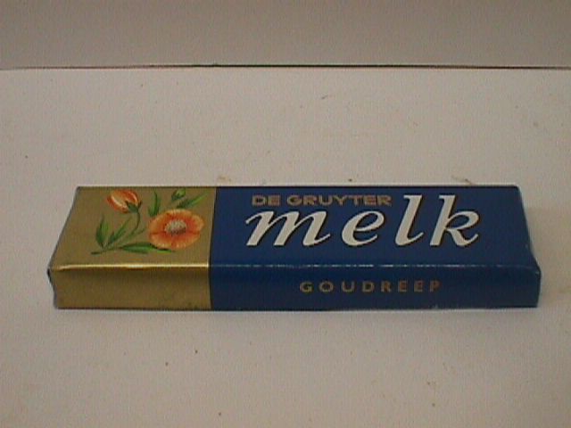- BeschrijvingDe Gruyter melk chocoladereep, verpakt in goud- met blauwkleurig papier, waarop een bloem is afgebeeld.
